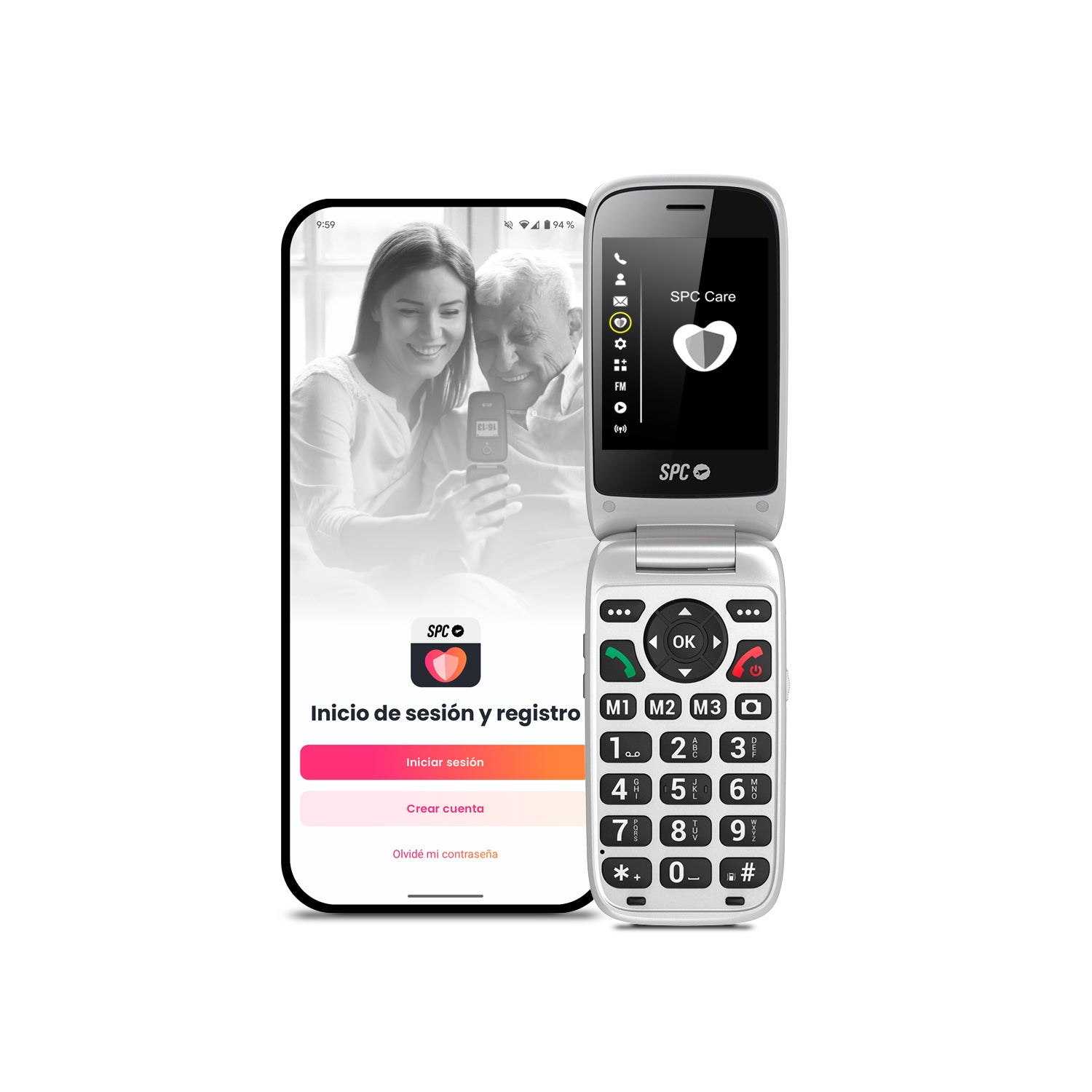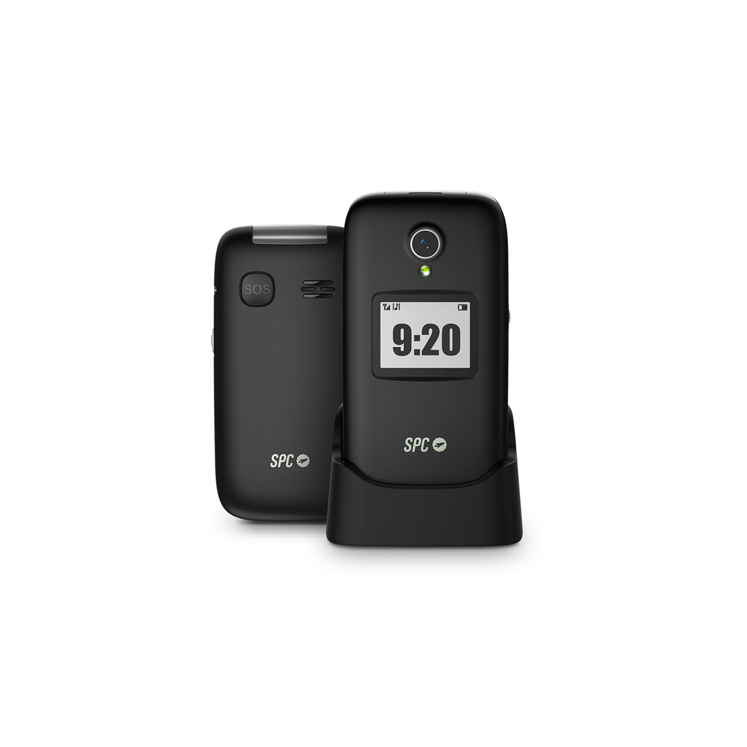 Teléfono móvil para personas mayores compatible con la aplicación de control remoto SPC Care. Con conexión 4G, botón SOS, 2 pantallas, 3 memorias directas y compatible con audífonos.