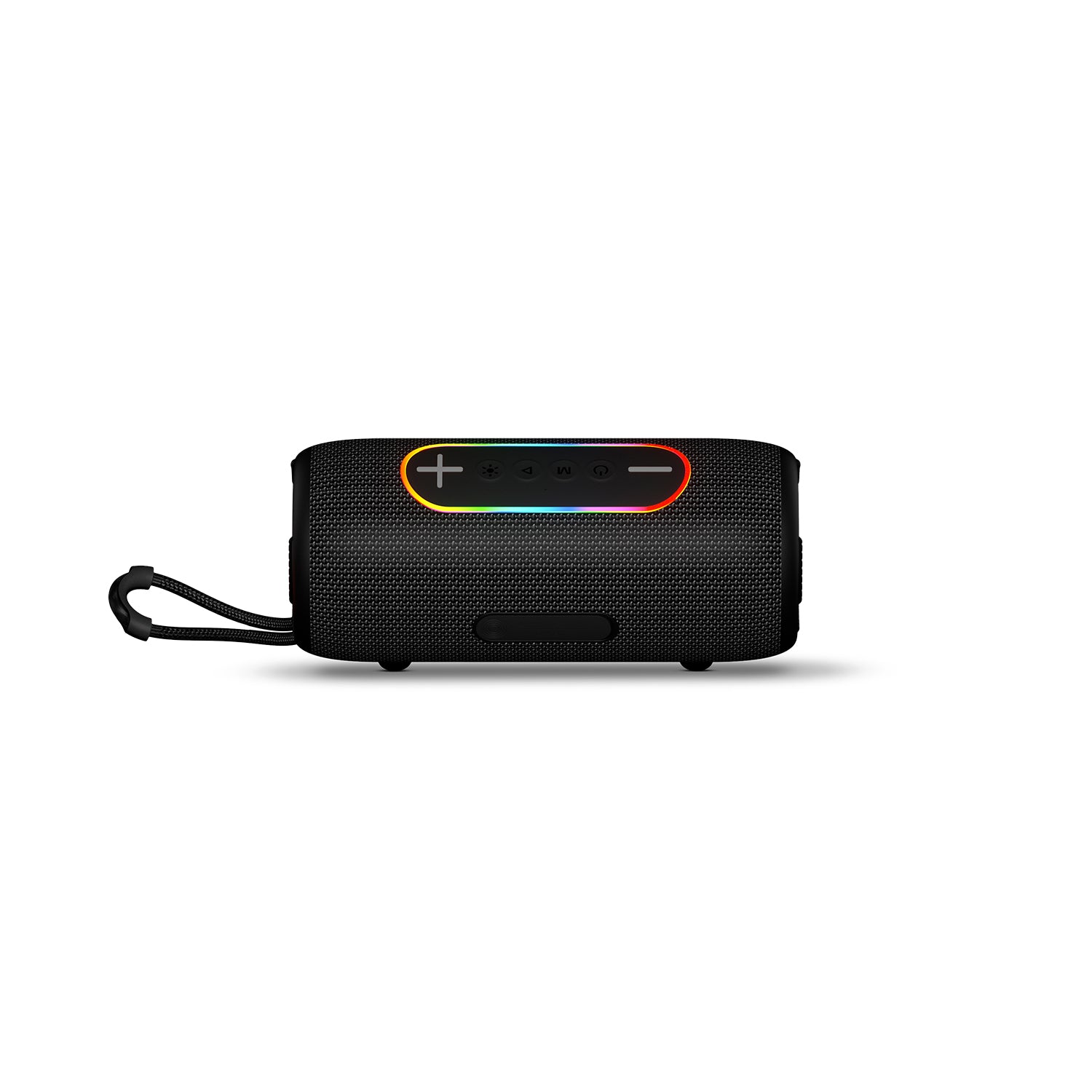 Altavoz Bluetooth con 60W de potencia y dos grandes membranas para un sonido espectacular, luz al ritmo de la música opcional, 20 horas de autonomía, alta resistencia al agua y correa integrada para llevar cómodamente.
